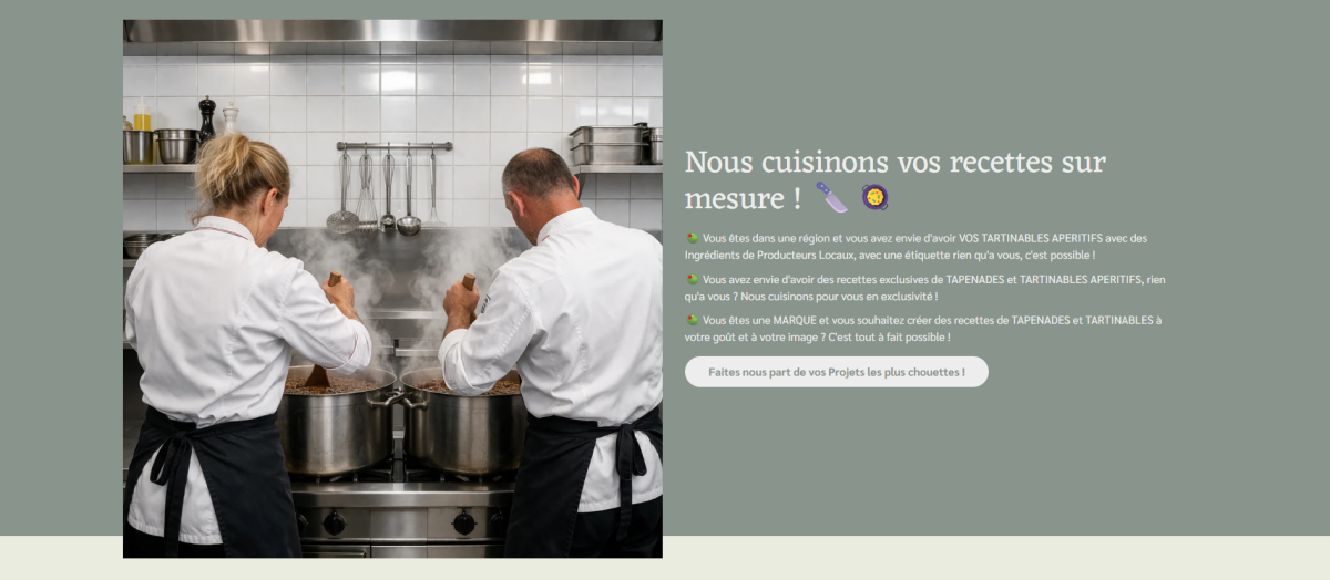 Nous voulons volontairement rester une Petite Fabrique Artisanale, nous ne voulons pas devenir un industriel, nous voulons continuer à proposer des produits d'excéption et à prendre le temps de cuisiner des recettes de Tapenades et Tartinadettes qui n'existent nulle par ailleurs...